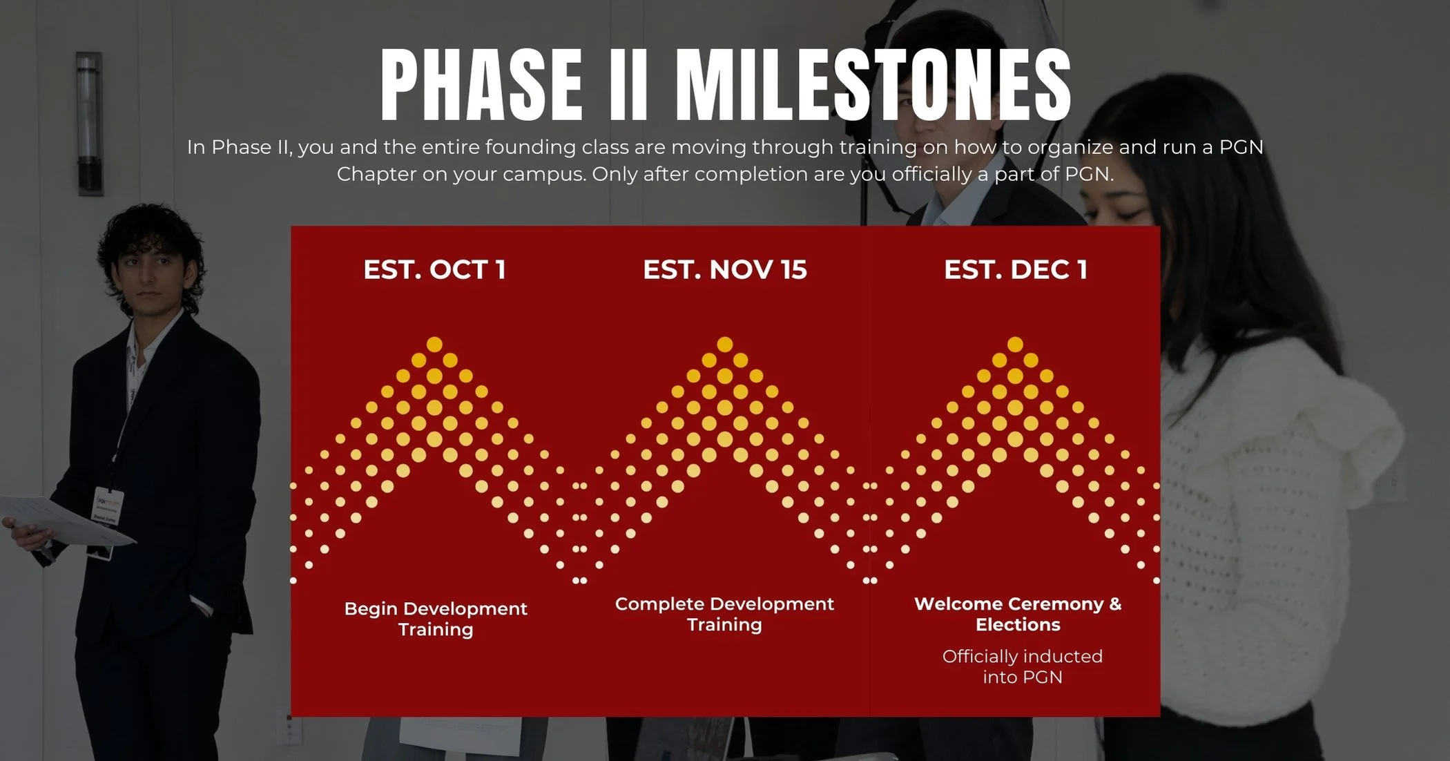 After this point, you and the entire founding class enter phase II. Together, you move through training and learn how to organize and run a PGN chapter on campus.